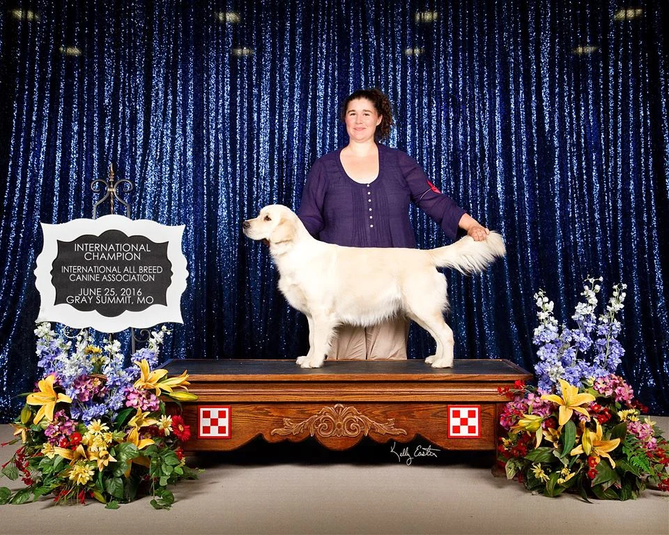 Timber also has hips that are rated in the top 10% (left DI:0.23 and right DI:0.38) of all Golden Retrievers, with his heart and eyes cleared by certified veterinarians. Our goal is to improve the breed while producing excellent puppies for the American family. He is a 100 lb gentle giant: very sweet and tender with puppies and small children. He is also an international champion and has several confirmation titles under his belt. Timber is impressive in every way. From his square masculine head to his engaging personality, he is everything a golden should be.